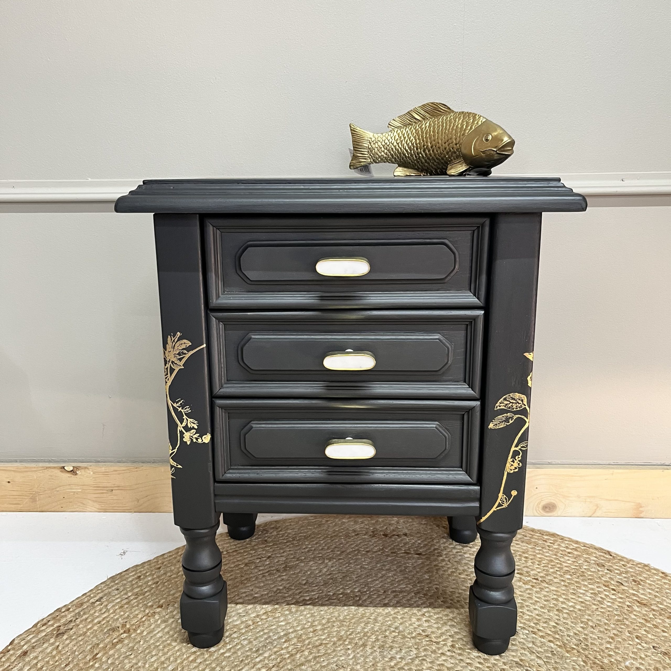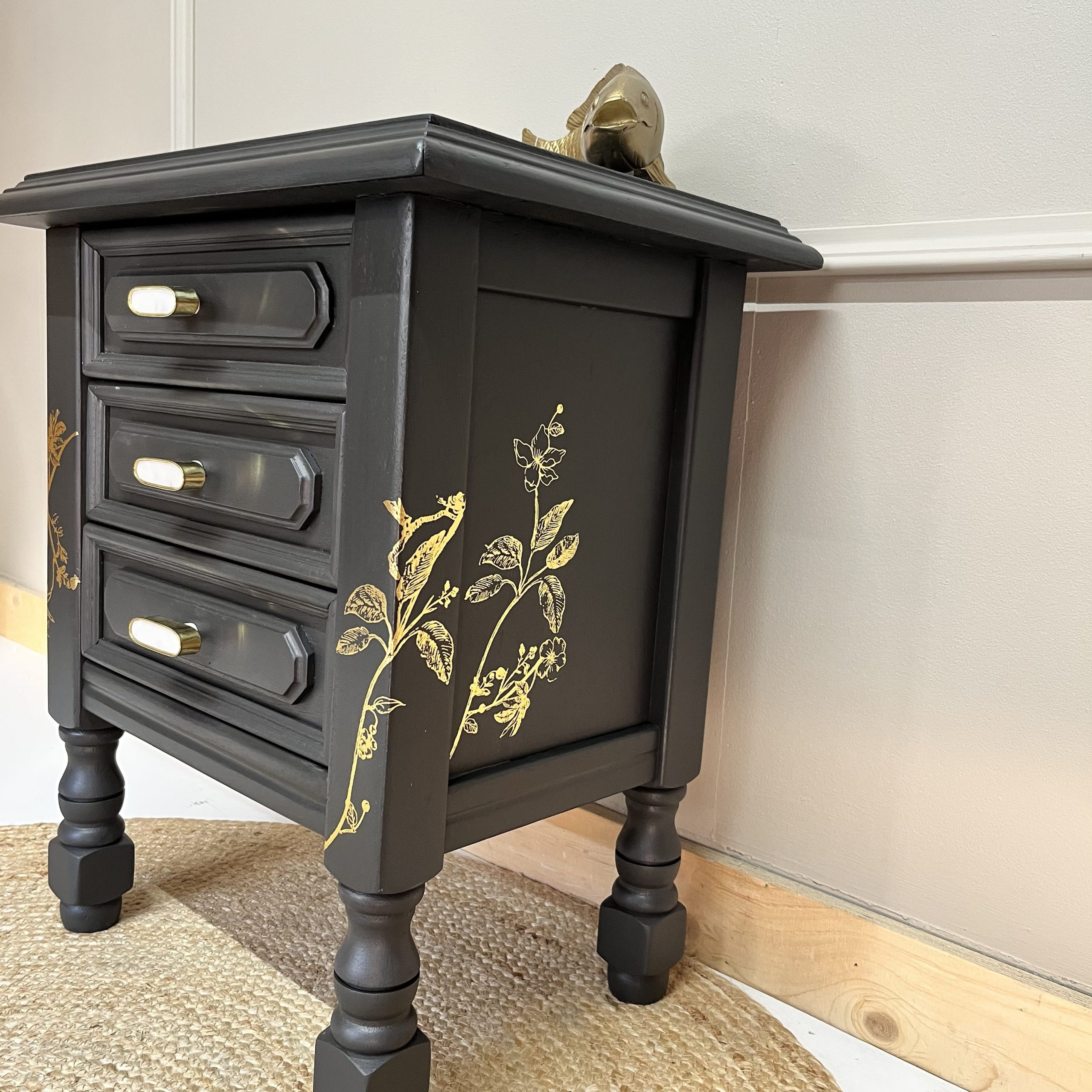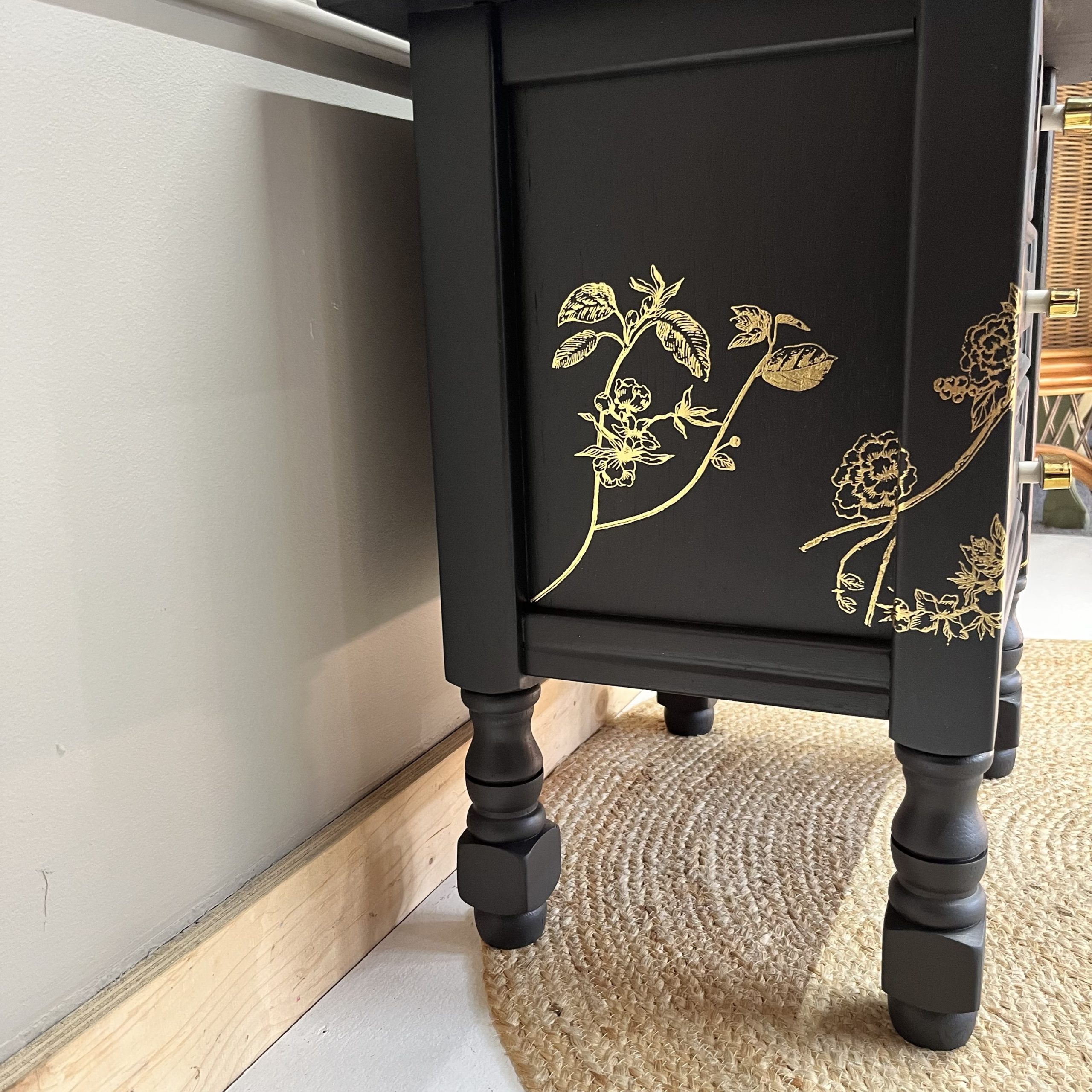 En een transfer op meerdere zijdes van het kastje, met gouden bloemen als accenten.